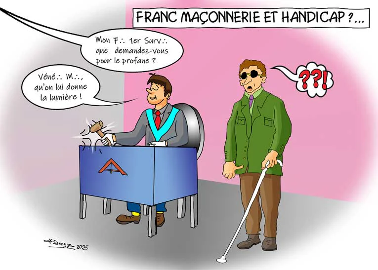 Cette semaine encore, notre dessin d’humour pointe ses crayons de couleurs sur nos Sœurs et nos Frères dits « handicapés ». Le Frère Jean-Claude nous gratifie d’un dessin d’humour maçonnique pas si fictif que cela. Nous en profitons pour adresser un petit clin d’œil spécial à la Loge Héphaïstos, Humanisme et Handicaps du G∴O∴D∴F∴.