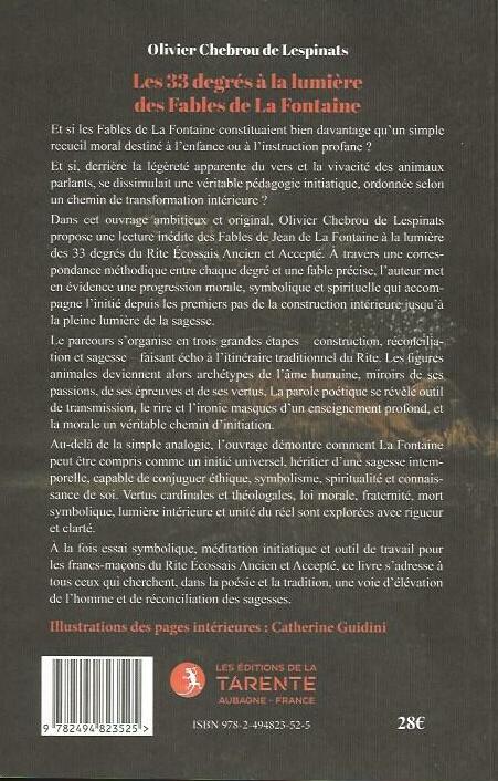 Avec Les 33 degrés à la lumière des Fables de La Fontaine, Olivier Chebrou de Lespinats propose un ouvrage singulier et ambitieux où la sagesse du poète du Grand Siècle vient éclairer, degré après degré, l’itinéraire du Rite Écossais Ancien et Accepté (REAA). Bien plus qu’un jeu de rapprochements, ce livre dessine une véritable morale initiatique et redonne à la fable sa puissance de discernement, de méditation et de transformation intérieure.