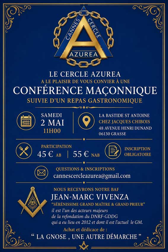 Le 2 mai prochain, sous l’impulsion du Cercle Azurea de Cannes et de son fondateur Michel Mesnard, une rencontre singulière se tiendra à Grasse. Entre exigence initiatique et convivialité éclairée, la venue de Jean-Marc Vivenza promet un moment de haute tenue autour de la gnose et du Régime Écossais Rectifié.