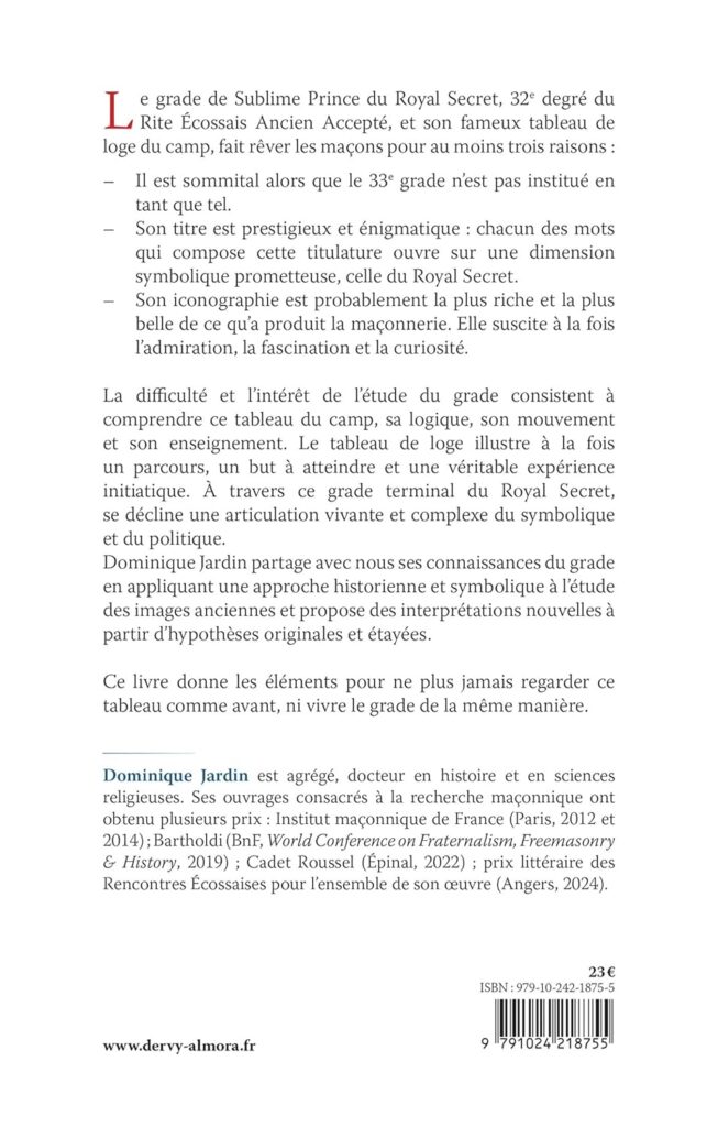 Avec Le grade maçonnique de Sublime Prince du Royal Secret, Dominique Jardin signe un ouvrage rare, savant et profondément initiatique. En explorant le tableau du camp, ses bannières, ses flammes, ses anges, sa géométrie et sa Gloire centrale, il rend lisible l’un des grades les plus complexes du Rite Écossais Ancien et Accepté. Ce livre n’est pas seulement une étude iconographique. Il est une traversée du regard, une méditation sur le Royal Secret, une mise en lumière de ce lieu mystérieux où le symbole devient pensée, où la mystique rejoint la cité.