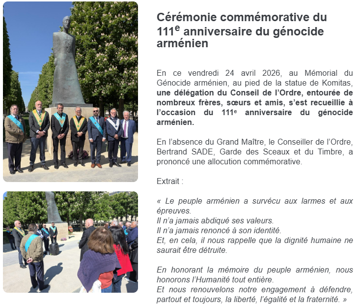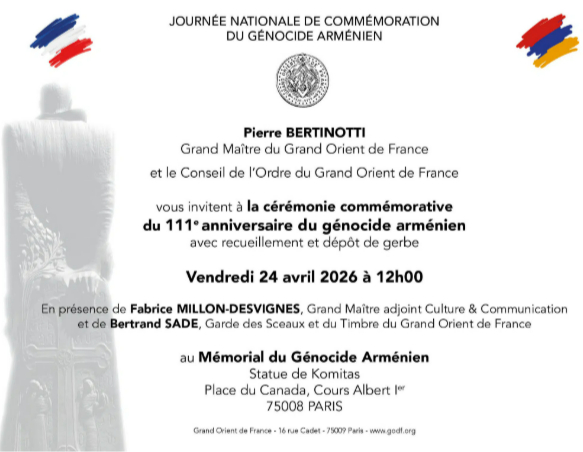 Elle rappelait que la mémoire arménienne n’est pas seulement un objet d’histoire ou de diplomatie mémorielle, mais aussi une fidélité vécue, transmise et portée au sein même du travail maçonnique. La Lettre d’information du Grand Orient de France du 24 avril 2026 rendait d’ailleurs compte de cette commémoration, soulignant ainsi l’importance accordée par l’obédience à ce moment de mémoire, de vérité et de vigilance.