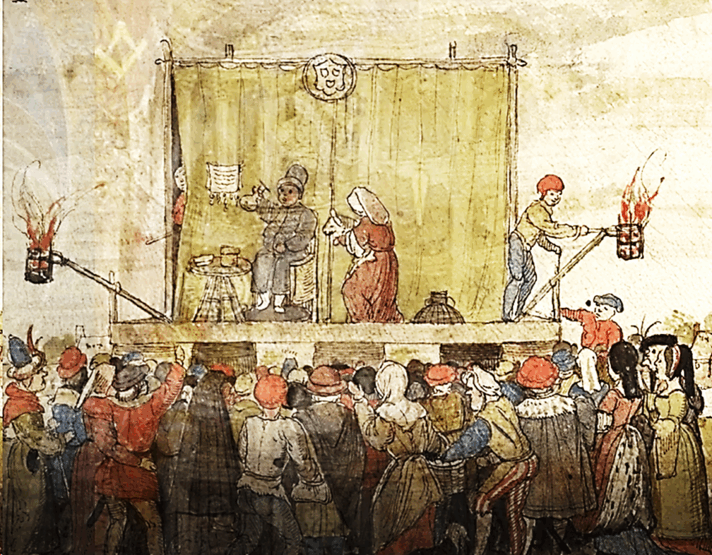 Ainsi, «Les antécédents du drame hiramique doivent être cherchés dans les représentations des mystères, ces scénettes d’inspiration biblique jouées au Moyen-âge dans les églises d’abord, sur les parvis ensuite, avant de l’être en différents lieux de la ville. Réservées aux grands moments de l’année liturgique, ces représentations étaient souvent confiées aux corps de métier, guildes ou corporations, qui les finançaient et en assuraient la réalisation.  Les mystères avaient pour objet des passages bibliques comme la Création, la faute d’Adam et Ève, le meurtre d’Abel, la construction de l’arche de Noé, le déluge, la visite des rois mages, le massacre des innocents, le jugement dernier.»