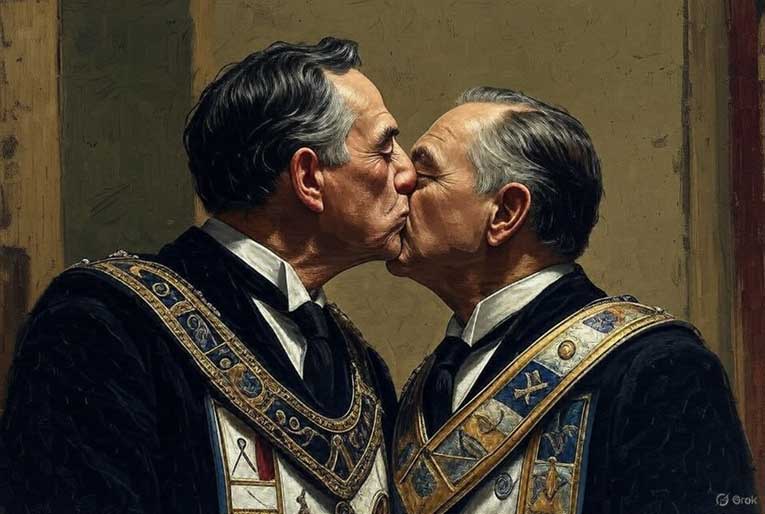 - Albert Pike (Morals and Dogma) : « The fraternal kiss is the symbol of the union of souls in the pursuit of truth. » (Le baiser fraternel est le symbole de l’union des âmes dans la quête de la vérité.)